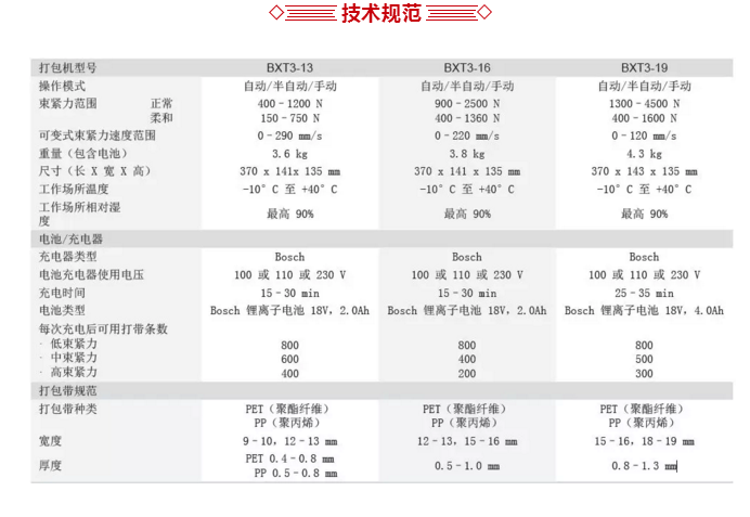 BXT3智能電動打捆工具適用于PP/PET等塑料打包帶,并廣泛應用于各種輕型、通用和重型打捆場合需求。