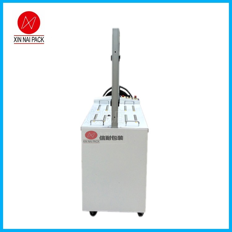 性能特點:XN-MH101A自動捆包機(高臺標準型)可以實現自動打包,但臺面無動力,需要人工推一下,包裝物品才能通過打包機。該打包機的原理是使