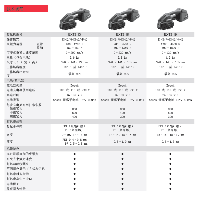 BXT3智能電動打捆工具適用于PP/PET等塑料打包帶,并廣泛應用于各種輕型、通用和重型打捆場合需求。
